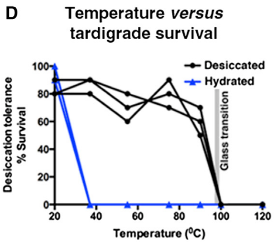 Goldstein实验室认为,水熊虫在干燥脱水的过程中形成非晶态固体,好像水快速冷却的过程中没有冰晶的形成,从而达到透明似玻璃的固体状态,保存了细胞中蛋白质和脂质膜的结构,也就是“玻璃化”。水熊虫在脱水的过程中,CAHS蛋白也会玻璃化,参与保护。当然这种保护是有限度的,如果环境温度过高,超过了“玻璃转化温度”(指玻璃态物质从玻璃态转化成高弹态的温度),玻璃化就遭到了破坏,类似结晶固体越过了熔点从而变成了液态。不论是在水熊虫还是在单细胞酵母中,当环境温度超过了CAHS蛋白的玻璃转化温度,保护力被破坏,生物也无法存活。