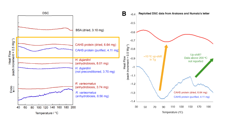 对于CAHS蛋白玻璃化的检验,原作者也要来了日本科学家的实验数据进行了重新分析和作图。通过将纵轴的尺度拉伸使其颗粒度更小,显示出不论是完全脱水还是原先实验中含有一定水分的蛋白样品,都出现了玻璃转化温度。而且已知完全干燥的样品会有向更高温偏移的情况,所以80摄氏度的峰偏移到了95摄氏度,160摄氏度的峰偏移出了测量范围也解释得通。这样就反驳了日本科学家——他们认为完全干燥样品不出现玻璃转化温度,CAHS蛋白玻璃化的结果是其中含水量造成的错觉。由于对这样的测量结果没有严格统一的统计学上检测显著的标准,无法准确定义一个玻璃转化温度,所以双方各执己见,无法达成一致。