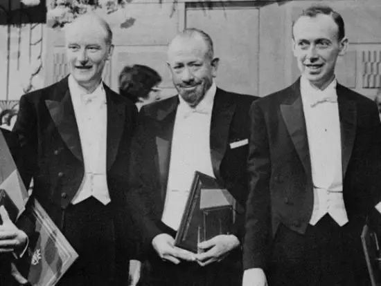 1962年,克里克(左)、威尔金斯、沃森(右)共同分享了诺贝尔生理学或医学奖。图中间为文学奖得主约翰·斯坦贝克