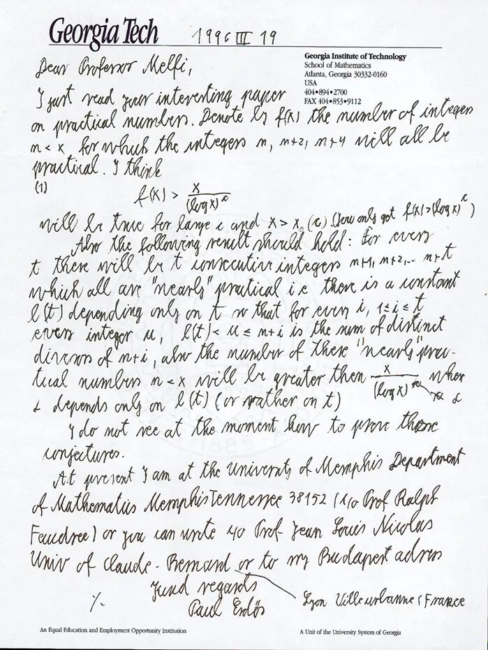 我记得爱多士当时写给我的,是某一类数论函数的均值估计问题。我没有做出来,却研究出了另一类数论函数的均值估计,那是我的导师潘承洞的胞弟——北大教授潘承彪带给我的,这类数论函数均值估计的先驱人物也是爱多士。换句话说,我改进了他的结果,准确地说是改进了他和一位叫阿拉底的印度数学家合作的结果。不仅早早发表在《科学通报》上,提前获得了硕士学位,而且借此夺得了山东大学首届研究生论文奖的头名。尽管如此,我没有成为爱多士数[1](与爱多士合作发表论文),这是我的终身遗憾。