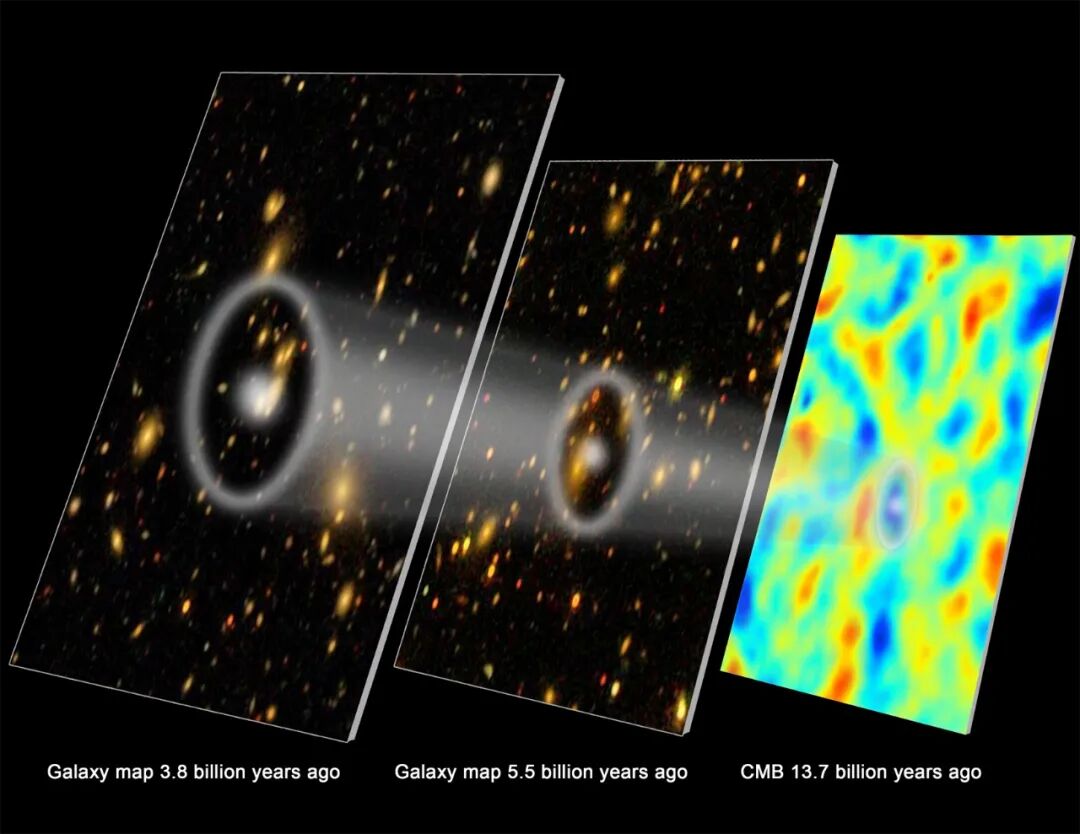 这把尺子的形成还得从宇宙的早期说起。宇宙诞生之初,各处的密度虽十分均匀,但局部仍然存在微小的起伏。这种密度的不均匀性会以声波的形式向外传播,形成一个球壳形的波纹,就像在平静的水池里滴入一滴水所形成的涟漪一样。到宇宙38万岁时,由于宇宙的温度随着膨胀不断降低,这种声波会突然被冻结住。“涟漪”便不再向外扩散,而是固定在时空背景之上,只随着宇宙的膨胀而逐渐变大(图 4)。这曲遥远宇宙华章的绝响便遗留至今,直到被我们“听见”。