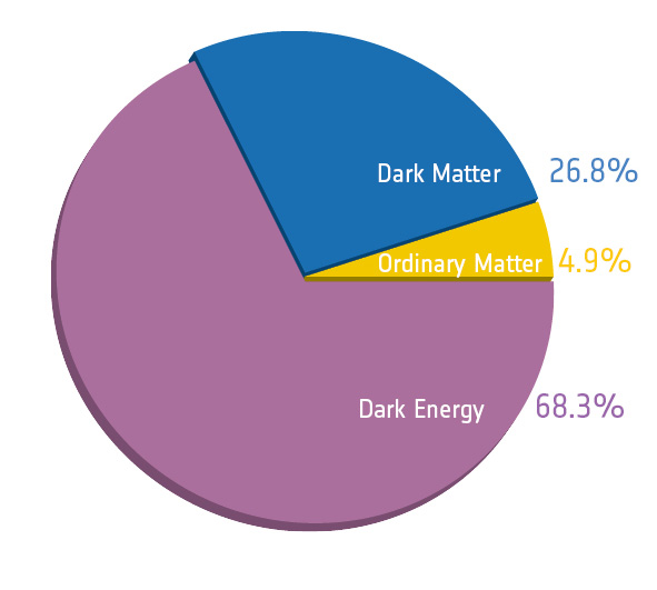 天文观测促使宇宙学进入“黄金时代”的同时,也对物理学提出了重大的挑战。粒子物理学的标准模型预言的所有基本粒子均已被发现,而以宇宙微波背景辐射(CMB)为代表的的观测却表明这些已知粒子只占到了现今宇宙能量组成的5%左右,正是这5%,组成了我们,以及我们看得见、摸得着的万事万物。而在我们一切经验之外的那95%中,有约25%是暗物质,约70%是暗能量(图 2)。这“两暗”可谓是笼罩在现代物理学上的两朵“乌云”,是对粒子物理标准模型的严峻考验,却也可能孕育着下一代物理学革命。