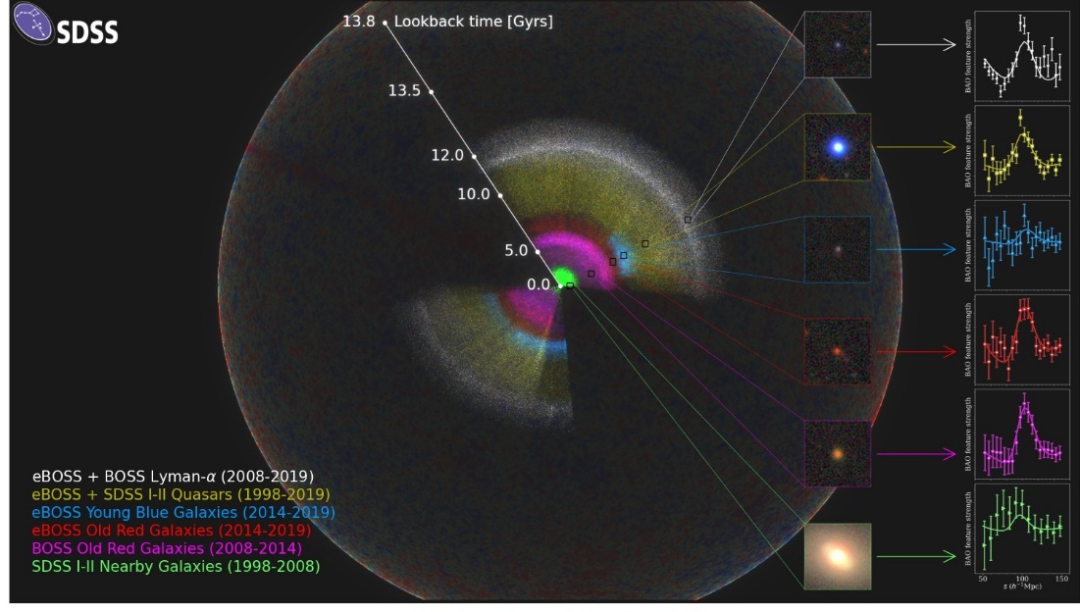 从星系的分布中,我们能测量到不同距离处这一“涟漪”的半径,从而获知宇宙在不同历史时期中的大小。SDSS项目正是据此,独立于CMB和超新星的观测得到了宇宙加速膨胀的结论[7]。同时,人们还在继续深入挖掘已有的宇宙三维地图数据,试图从宇宙过去110亿年中的膨胀经历中获知暗能量演化的更多细节。这也是一代又一代星系巡天项目孜孜以求的目标。