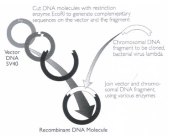 在保罗教授及其团队的努力下,这个设想被实现了!他们成功地开发出了一种能在体外将两个DNA连接在一起的通用方法。这种方法使用了一种能够在DNA的相同位置对其进行剪切的酶(EcoRI)。他们首先对两种环状DNA进行剪切,一种来自于可在大肠杆菌中繁殖的病毒,另一种来自于SV40。当这两种环状DNA被剪开变为线性的DNA后,研究人员使用了另外两种酶对这些线性DNA进行修饰,使这些DNA的末端能够相互吸引——就像魔术贴能够互相粘上一样。将这两种DNA混合到一起,它们就能重组形成一个全新的环状DNA。这种环状DNA包含了来自两种不同生物的基因,被称为重组DNA(rDNA)。