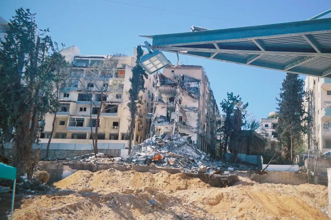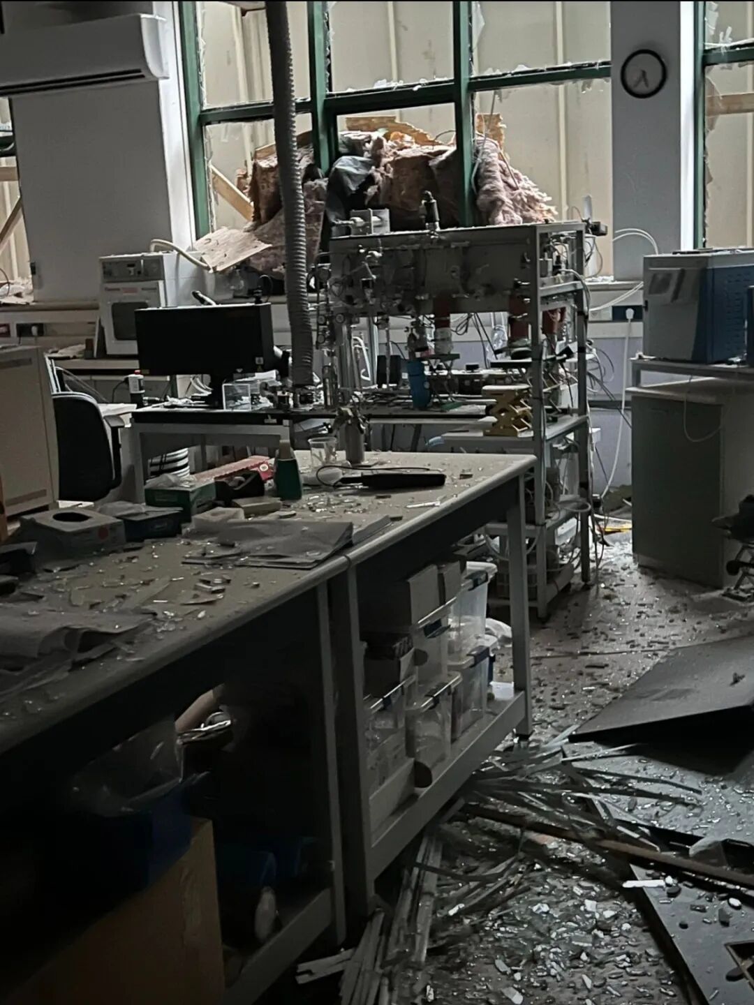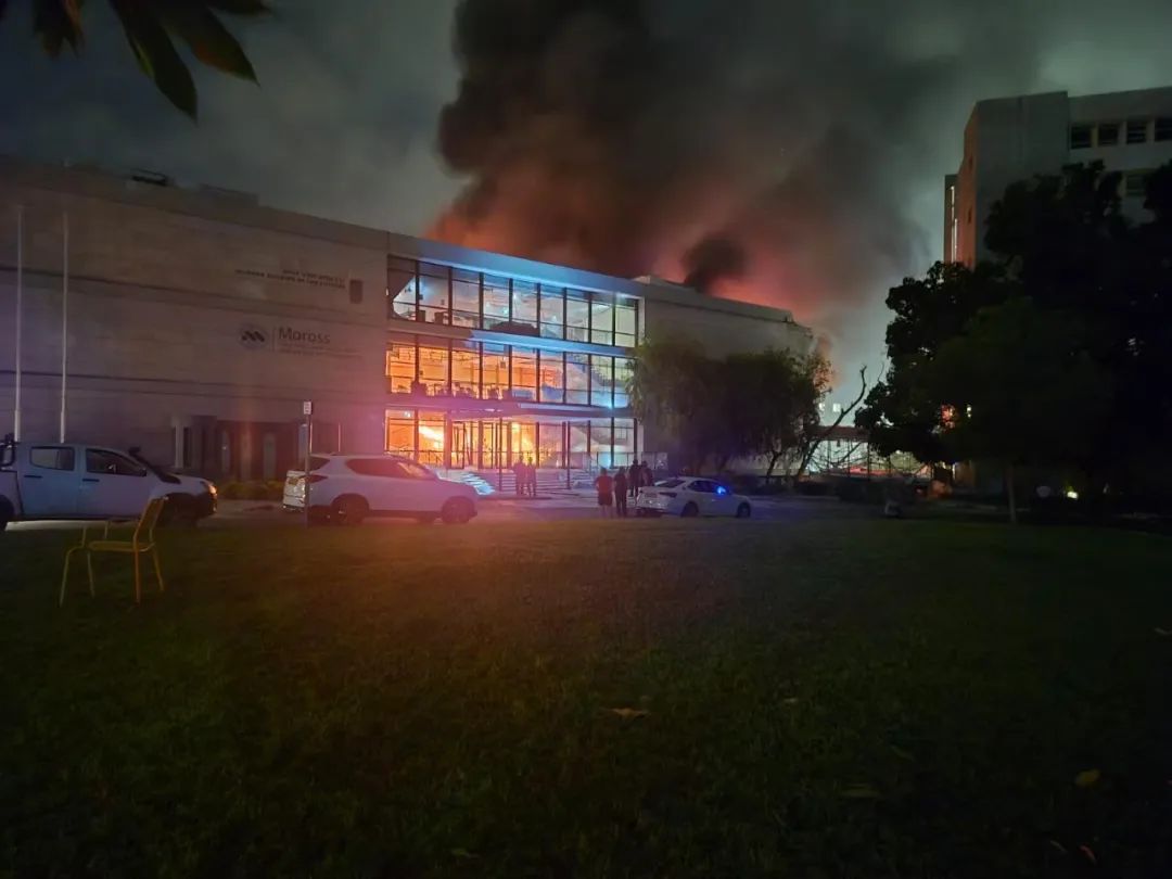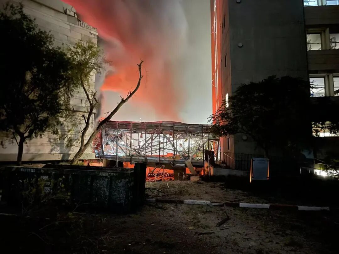 我的第一反应是难以置信,觉得应该只是导弹碎片击中了空地吧,毕竟商场这边确认被击中了。然而,图片和视频不断涌入:癌症研究中心半侧楼体被烈焰吞噬,连接廊桥断裂燃烧,火光映红夜空。说实话,视觉上非常壮观。越来越多的照片让我意识到,我熟悉的建筑几乎都受损,未起火的也门窗尽碎。我们实验室尽管没有被直接击中,楼内的冰箱门全被震开,警报声此起彼伏。精密仪器系统也都受到了严重损坏。