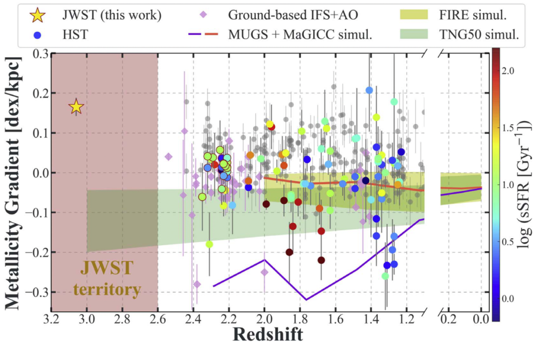 图5:GLASS-JWST项目测得首例红移高于3的星系的高精度金属丰度梯度,(这里可以增加一些图片说明,比如各色点、线代表的信息等)。图片来源:参考文献[5]